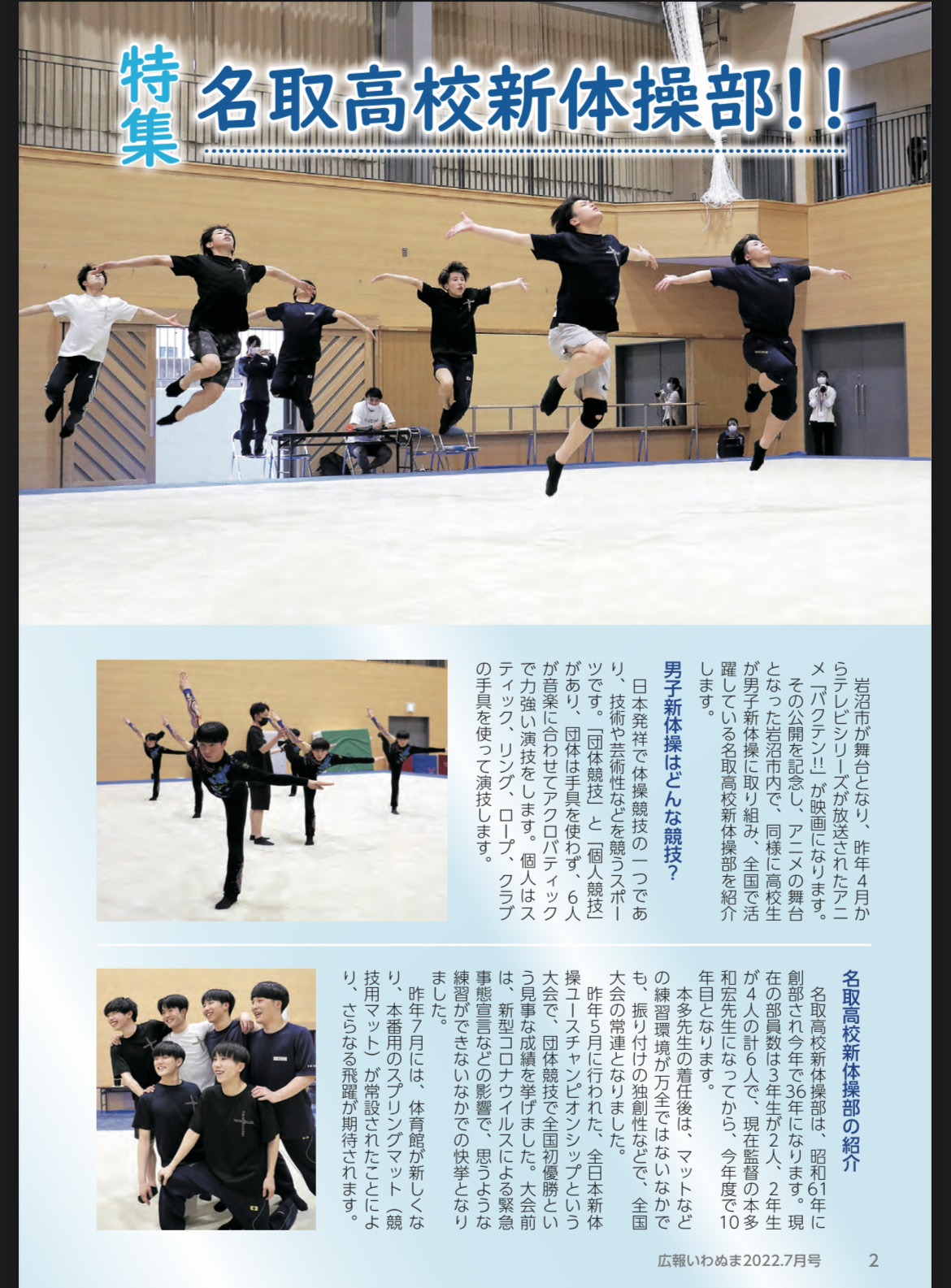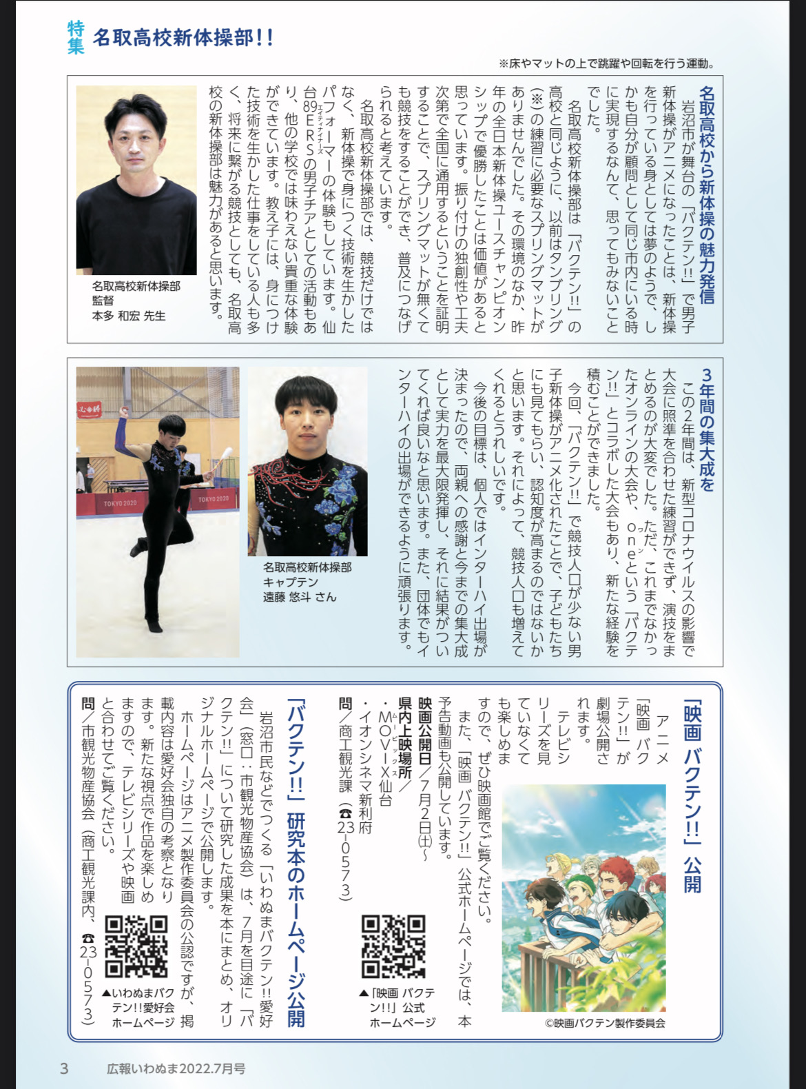 名取高校男子新体操部がモデルとなっている映画「バクテン!!」のPV動画が、YouTubeで配信されています。動画には、アニメに出てくる、アオ高モデルの「名取高校」と、シロ高モデルの「青森山田高校」の様々な部活動の様子が取り上げられています。青春している高校生の姿を是非ご覧下さい!